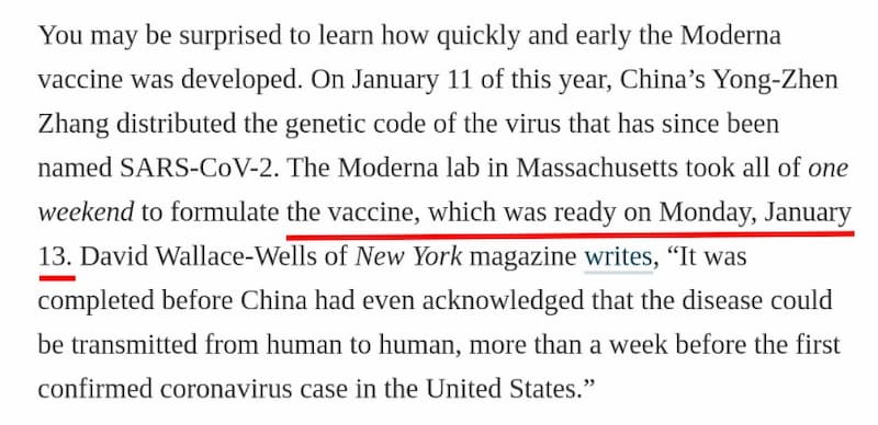 这个日期不仅早于武汉封城(1月23日),也早于美国第一例 COVID-19 病例(1月20日)。也就是说,Moderna 公司没有看到病例,对这种疾病基本上一无所知的情况下,就做出了疫苗,这也太惊人了。